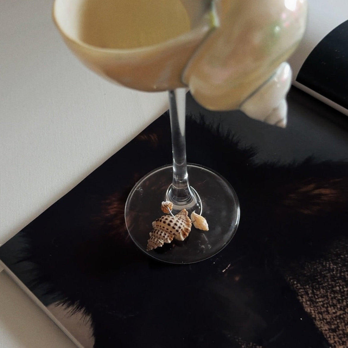 This is a set of four handmade seashell glass charms, crafted from natural seashells. Each set is naturally unique and designed to add an understated coastal elegance while keeping drinks easy to identify. Lightweight and easy to attach, they fit most stemmed glasses without scratching the surface.